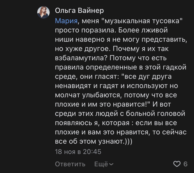 Блин, реальный треш. Вот нахрена она все это пишет?! Я даже понимаю отчасти Круглова с его постами, хочется человеку поговорить о вечном. Но то что пишет Ольга это... действительно похоже на психиатрию
