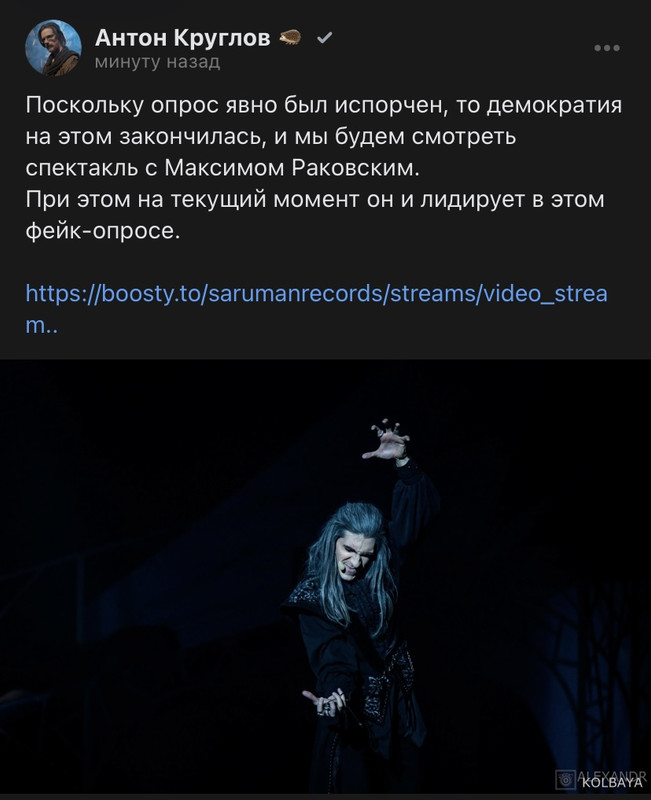 23.01.2025 в 14:35Поскольку опрос явно был испорчен, то демократия на этом закончилась, и мы будем смотреть спектакль с Максимом Раковским.